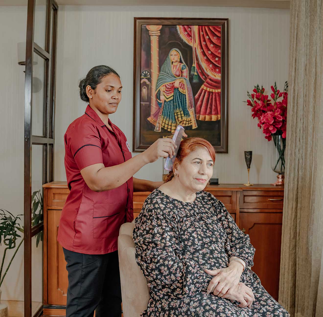 Our HOME HOSTESS offer professional grooming and etiquette care, ensuring your loved ones always look and feel their best. From assisting with personal grooming routines, like hair care, dressing, and hygiene, to guiding proper table manners and social etiquette, they provide thoughtful attention to every detail.